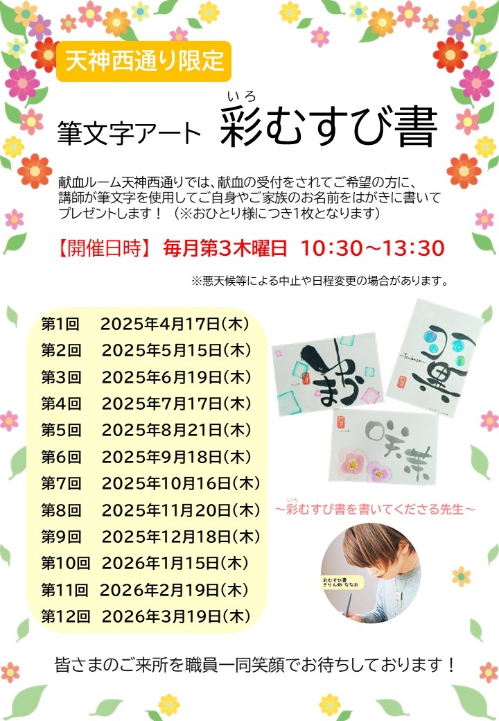 献血ルーム 天神西通りでは、「筆文字アート ~彩むすび書~」のイベントを毎月下記日程にて開催します。