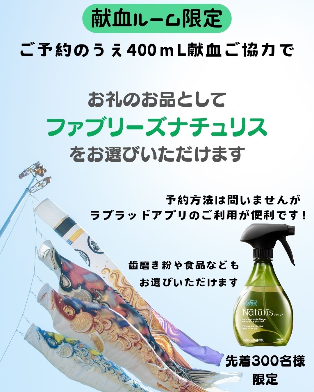 ご予約のうえ、400mL献血ご協力で、お礼のお品として「ファブリーズナチュリス」をお選びいただけます!