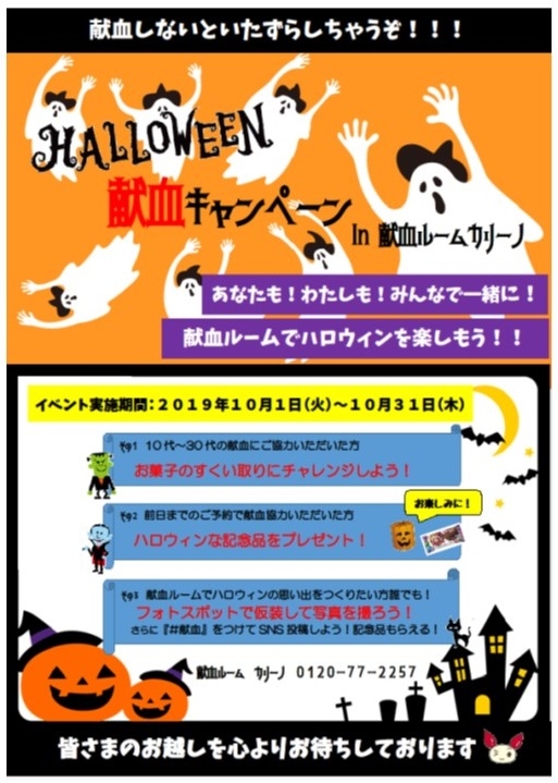 10月1日(火)~31日(木)の期間、献血ルームカリーノにて『ハロウィン献血キャンペーン』を開催いたします。
