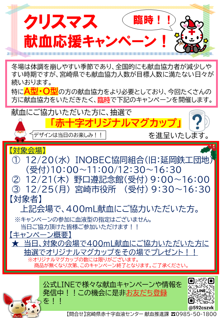 <宮崎県赤十字血液センター公式LINE 友だち追加は下のボタンをクリック> <初めての献血、久しぶりの献血、そんな全ての方へ> 献血の基準はこちら 献血前にご確認ください。 <献血バスの運行スケジュール・献血のご予約は下の献血バスをクリック>