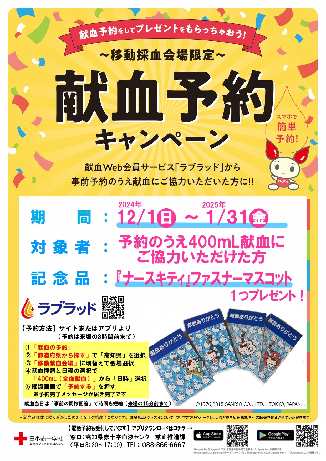 高知県内の献血バスでは、下記のとおり献血予約キャンペーンを実施中です。