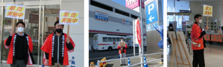 マスクをしっかりと着用し、真っ赤な献血のはっぴやたすきを着用し、のぼりの設置やPR看板を用いてご来店の皆さまへお声掛・会場内の誘導などをさせていただきました。