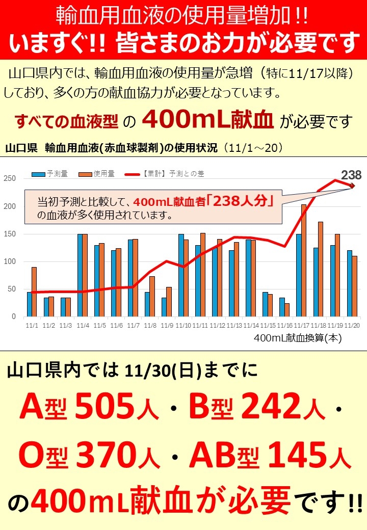 OA型:505人・B型:242人・O型:370人・AB型:145人の400mL献血が必要です!!