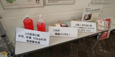 献血啓発ブースでは、献血についての問題やアンケート、パネル展示、ペットボトルを使って体重に対する血液量などを表示し、献血の際に使用する血液バックのサンプルも、手にとって見ていただけるよう設置いたしました。