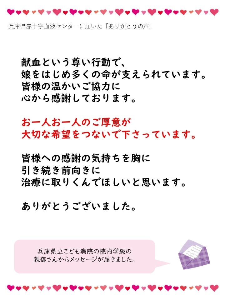 兵庫県赤十字血液センターに届いた「ありがとうの声」献血という尊い行動で、娘をはじめ多くの命が支えられています。皆様の温かいご協力に心から感謝しております。お一人お一人のご厚意が大切な希望をつないで下さっています。皆様への感謝の気持ちを胸に引き続き前向きに治療に取りくんでほしいと思います。ありがとうございました。