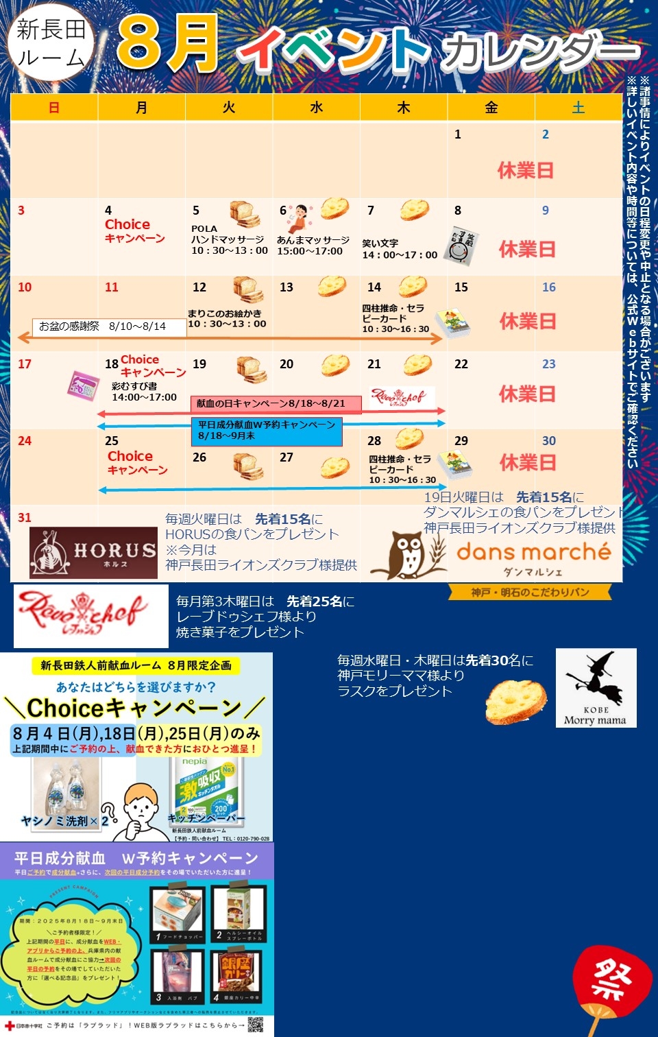 実施時間等の詳細は、各献血ルーム紹介ページでご確認いただくか、献血ルームまでお問合せください。