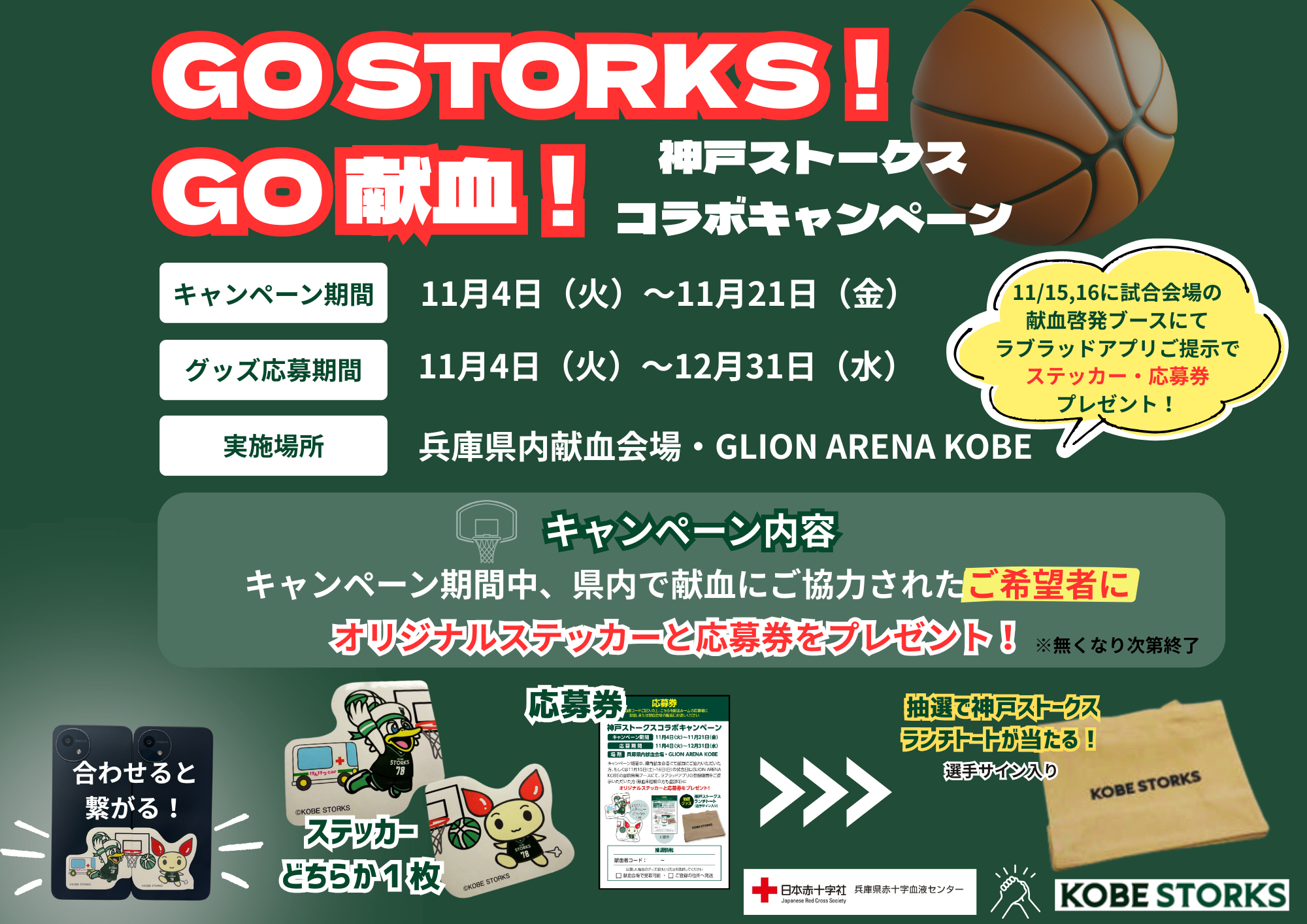 キャンペーン期間中、兵庫県内にて献血にご協力いただいたご希望の方へ、オリジナルステッカー(ストーキーorけんけつちゃん)と神戸ストークスのグッズが当たる応募券をプレゼント!
