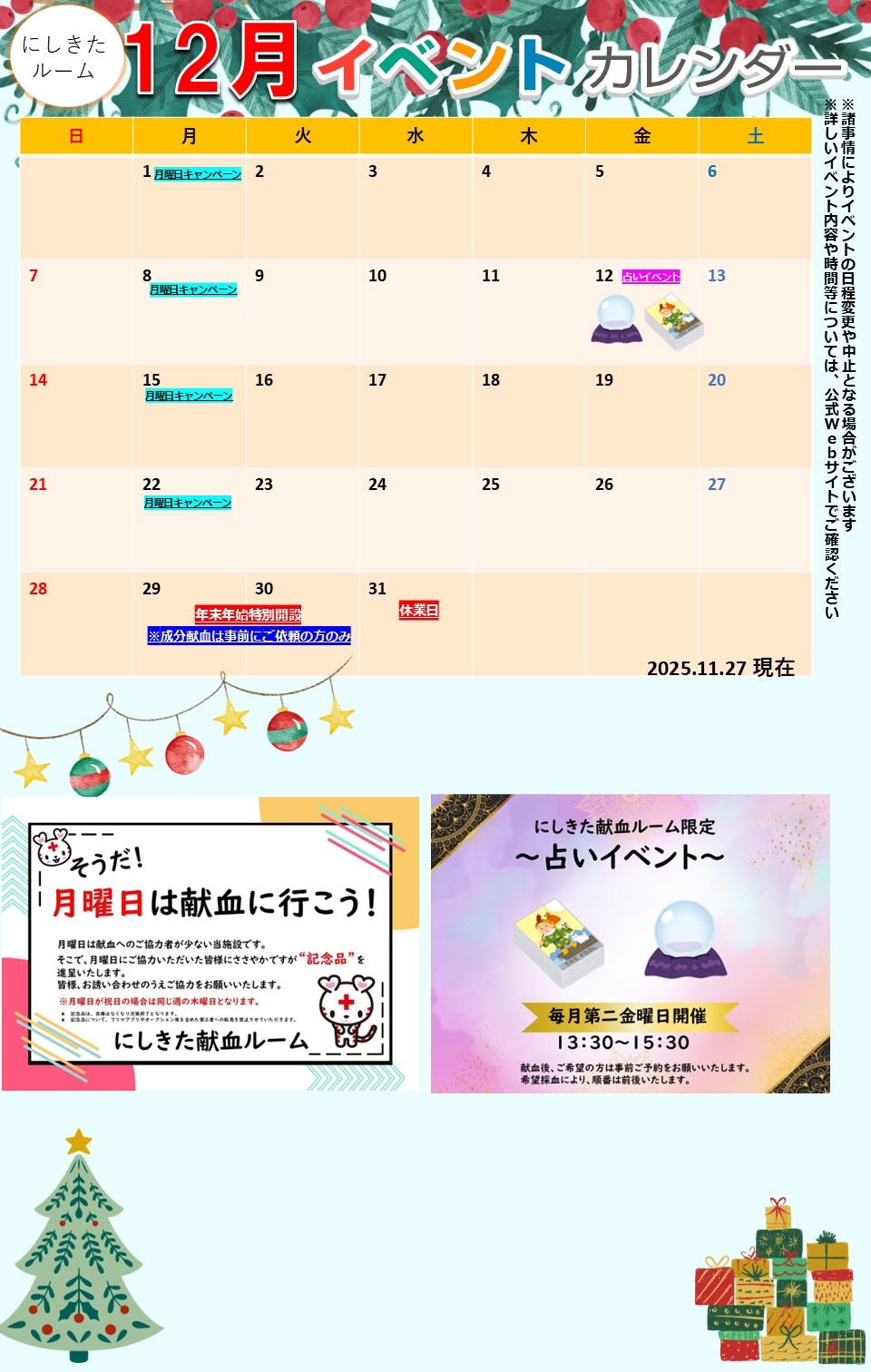 実施時間等の詳細は、各献血ルーム紹介ページでご確認いただくか、献血ルームまでお問合せください。