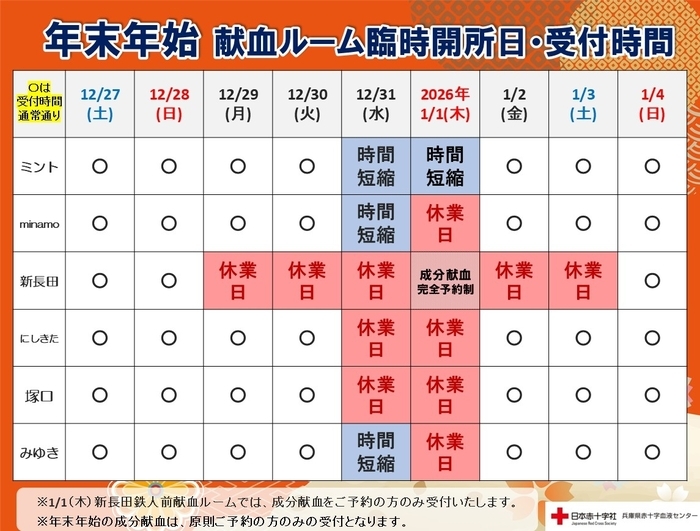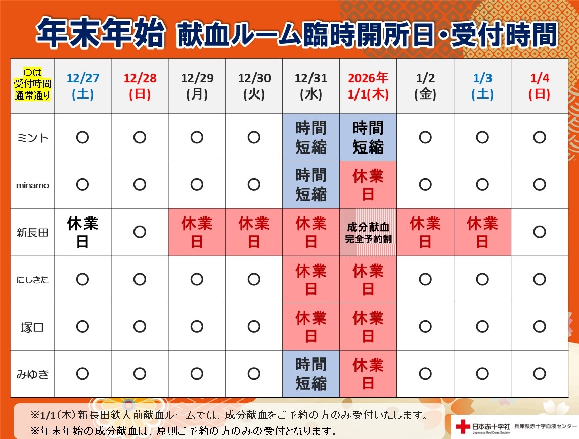 長期休暇中であっても輸血を必要とする患者さんはいつもと変わらずいらっしゃいます。年末年始でお忙しい時期かと思いますが、どうか皆様のご協力を心よりお待ちしております。
