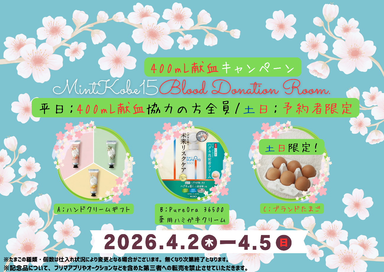 ≪ミント神戸15献血ルーム限定!!400mL献血予約・協力キャンペーン!!≫