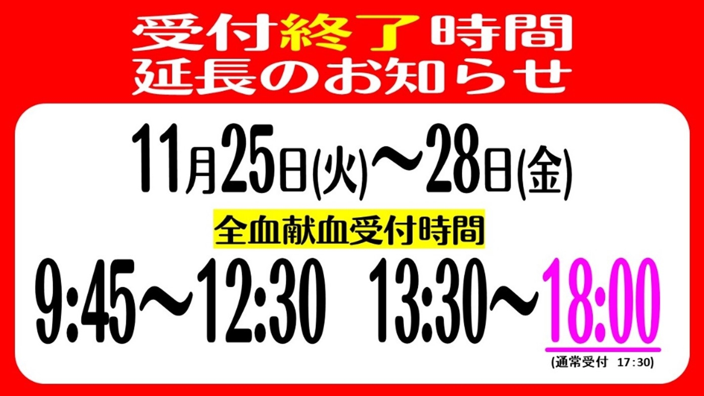 そこで、より多くの方にご参加いただけるよう、全血献血の受付時間を18時まで延長いたします。
