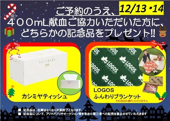 期間:12/13(土)・12/14(日) 土日限定!ご予約で400mL献血キャンペーン