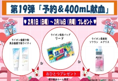 2/1(日)~2/16(月)、「ご予約」で「400mL献血」にご協力頂いた皆様にもれなく♪