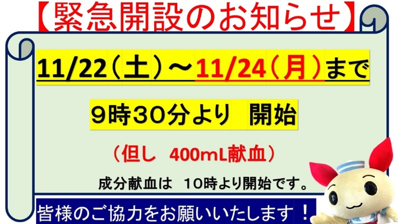 現在、血液の確保にたいへん困っていることから、多くの方にご協力いただくため、11/26(水)~11/30(日)の5日間、