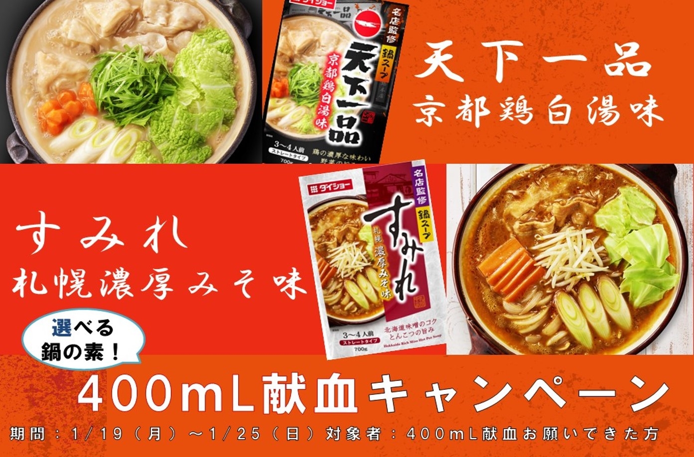1月19日(月)~25日(日)選べる鍋の素!400mL献血キャンペーン