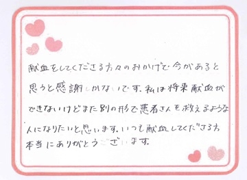 兵庫県赤十字血液センターに届いた「ありがとうの声」献血をしてくださる方々のおかげで今があると思うと感謝しかないです。私は将来献血ができないけどまた別の形で患者さんを救えるような人になりたいと思います。いつも献血してくださる方本当にありがとうございます。