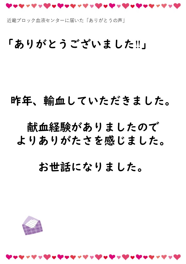 近畿ブロック血液センターに届いた「ありがとうの声」「ありがとうございました!!」昨年、輸血をしていただきました。献血経験がありましたのでよりありがたさを感じました。お世話になりました。