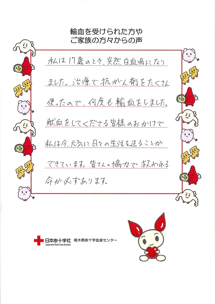 何度も輸血をしました。献血をしてくださる皆様のおかげで私は今、元気に日々の生活を送ることができています。皆さんの協力で救われる命が必ずあります。