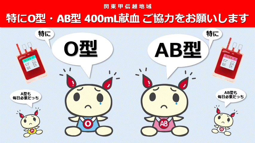 関東甲信越地域(茨城県、栃木県、群馬県、埼玉県、千葉県、東京都、神奈川県、新潟県、山梨県、長野県)では、特にO型・AB型の400mL献血のご協力を必要としています。輸血に使用する血液は人工的に造ることができません。医療機関へ血液を確実にお届けするために、今後も継続的な献血のご協力をお願いいたします。