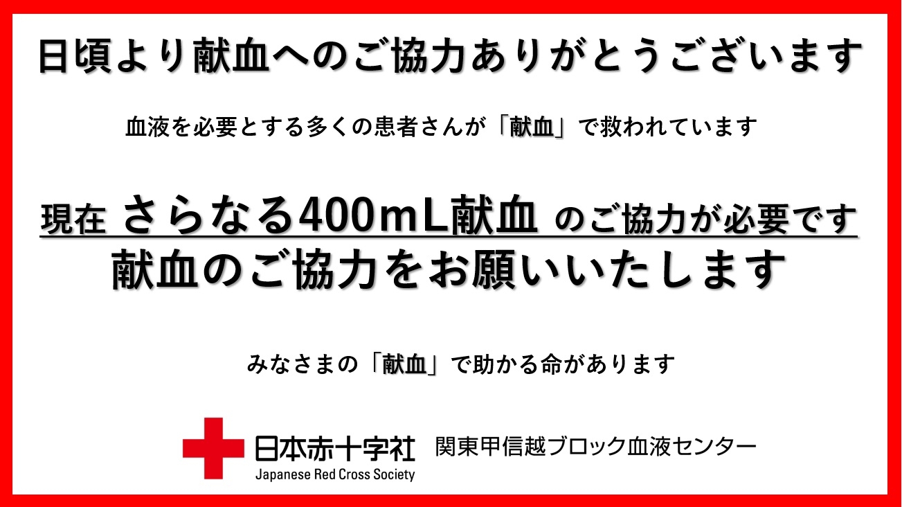 関東甲信越地域(茨城県、栃木県、群馬県、埼玉県、千葉県、東京都、神奈川県、新潟県、山梨県、長野県)では、特に400mL献血のご協力を必要としています。