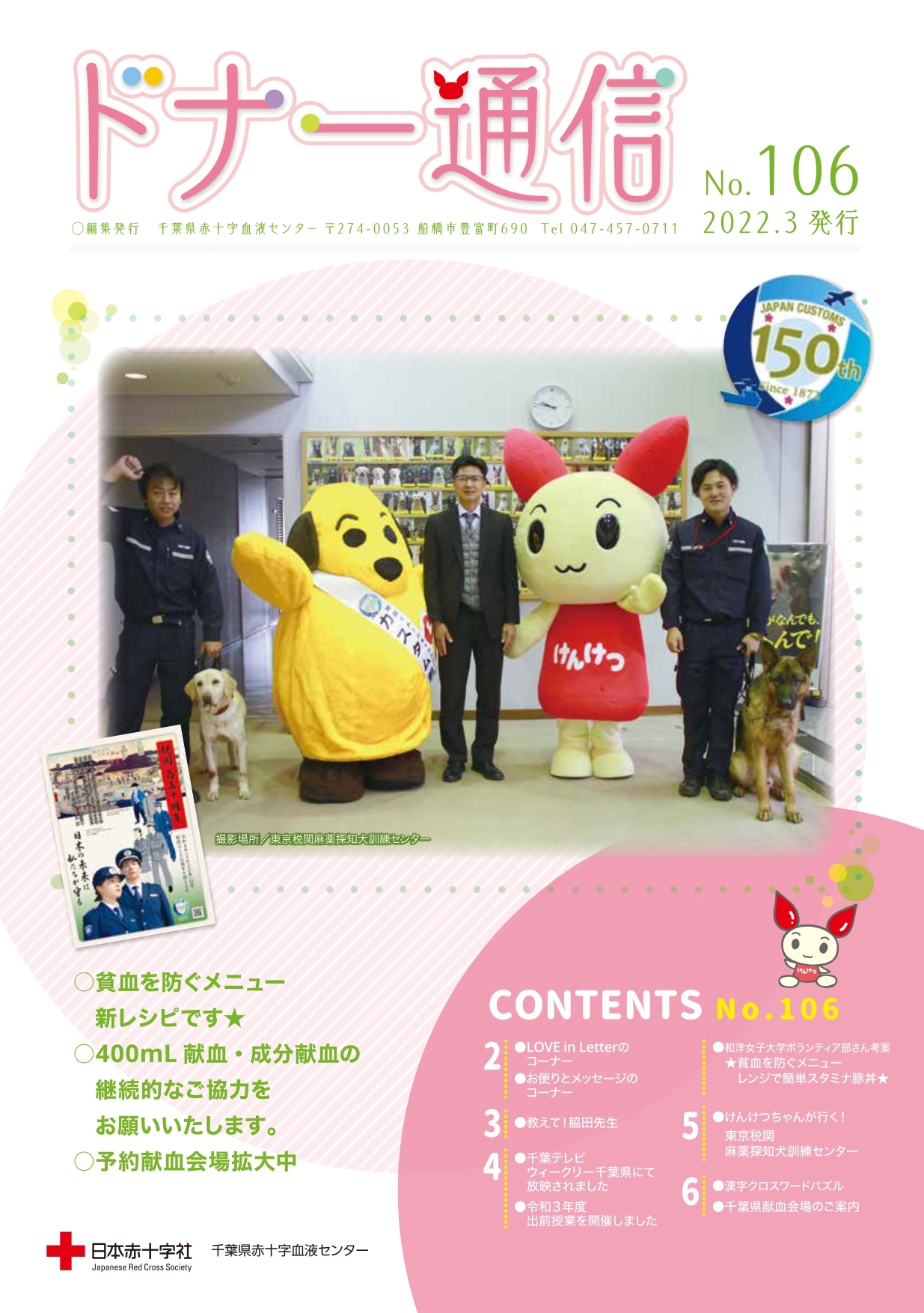 千葉県赤十字血液センターが発行する広報紙「ドナー通信」最新号が完成しました。 PDF版はこちらからご覧ください。 ◆ドナー通信No.106のWeb応募(※)アドレスはこちらをご利用ください。 ※ お便りとメッセージのコーナー/漢字クロスワードパズルコーナー/ 教えて!脇田先生コーナー