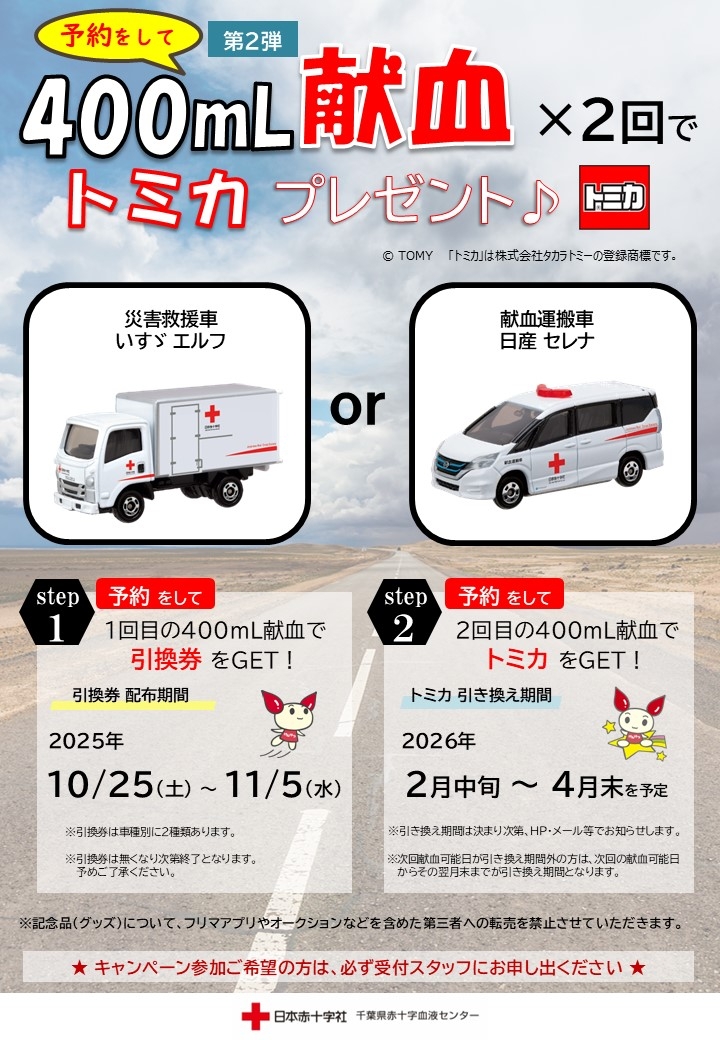・本キャンペーンの参加は、期間内に千葉県内の献血ルームでご予約のうえ、400mL献血をされた方に限ります。