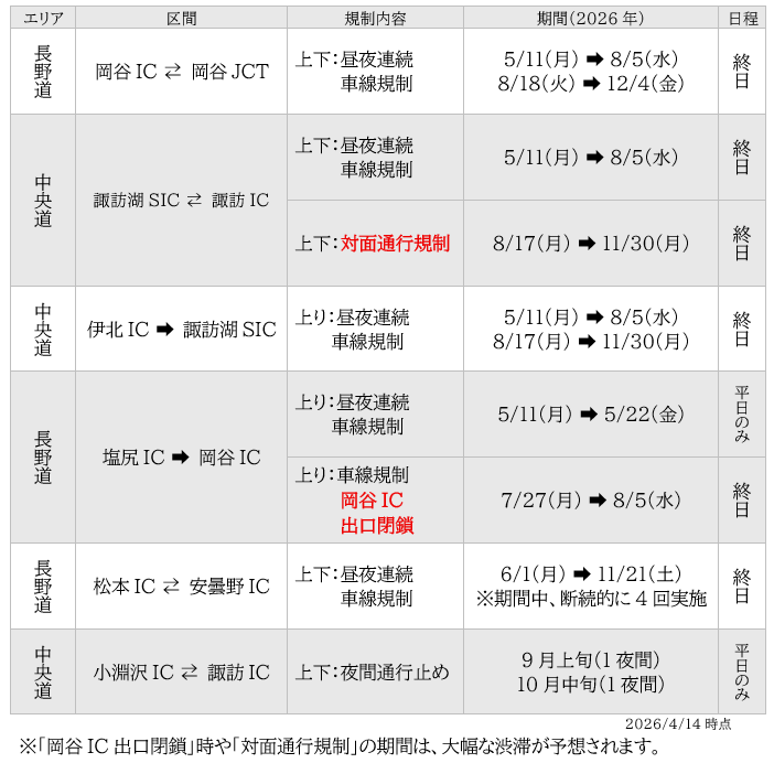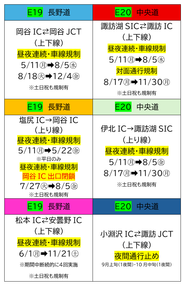 昨年度に引き続き、長野道・中央道における高速道路工事の影響で道路状況の悪化が予想されます。