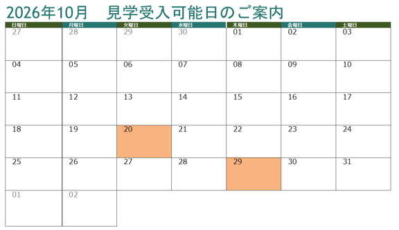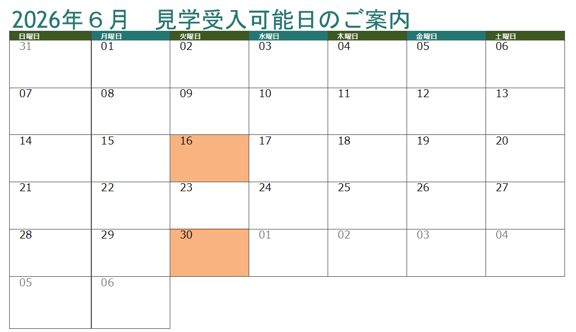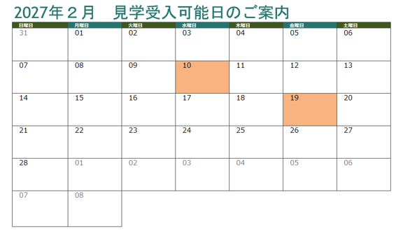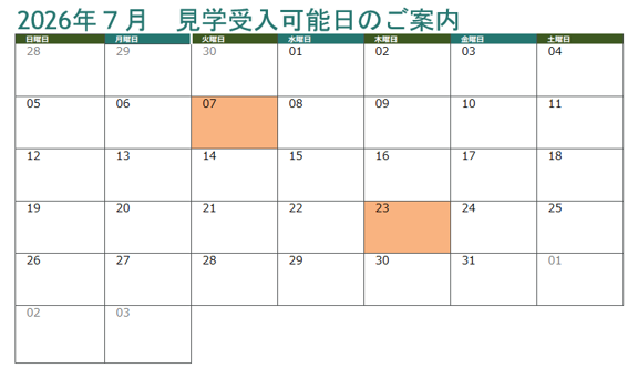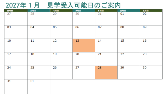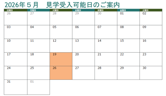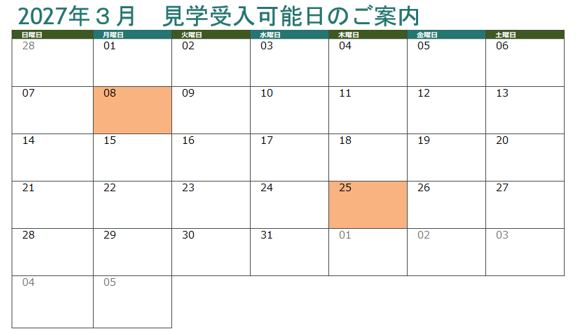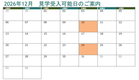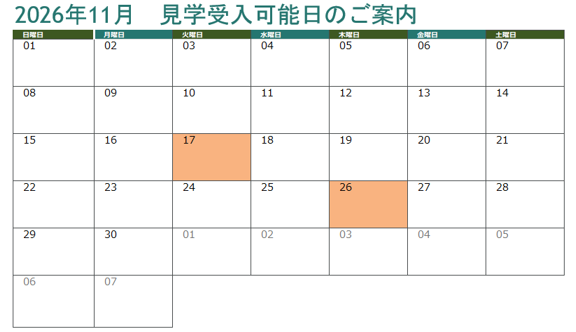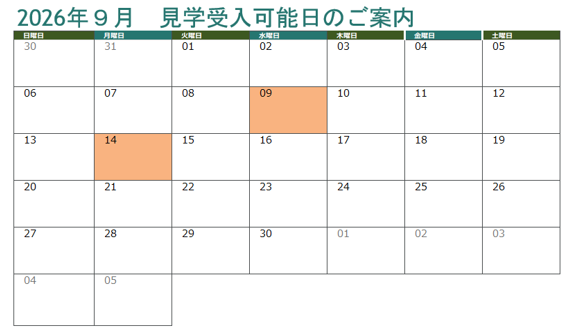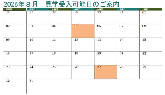 令和8年度の施設見学は、下記カレンダーに掲載された受け入れ可能日(オレンジ色の日付)よりお選びいただき、実施いたします。