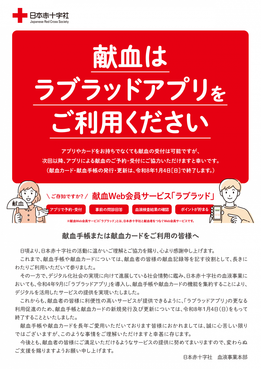 献血カードや献血手帳の新規発行・更新は令和8年1月4日(日)で終了するため、