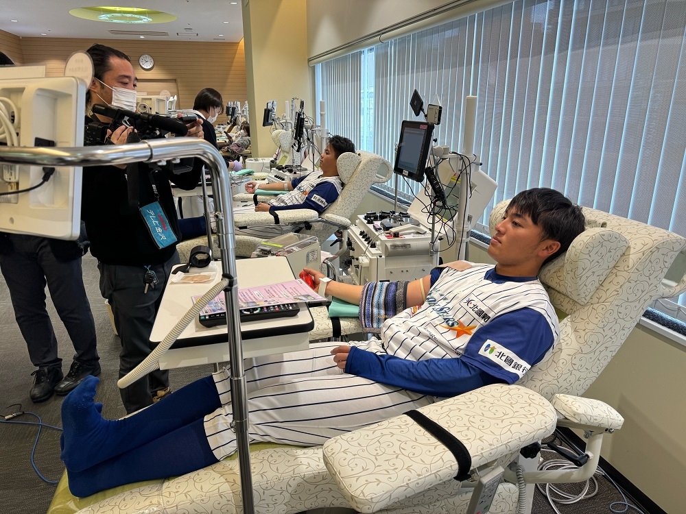 (献血をしながら取材を受けているミリオンスターズの背番号7番 倉知選手、背番号31番 松元選手)
