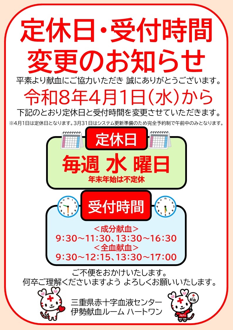 当血液センターの伊勢献血ルーム「ハートワン」の定休日及び受付時間を令和8年4月1日(水)から下記のとおり変更させていただきます。