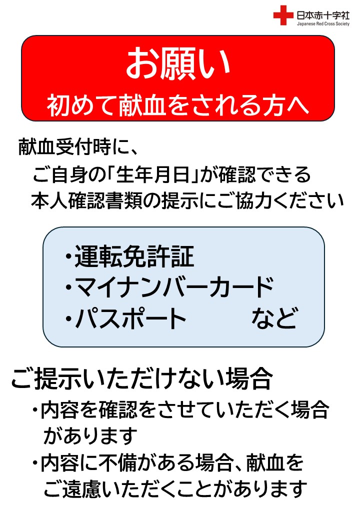 献血受付時には、ご本人の生年月日が確認できる本人確認書類の提示をお願いしております。